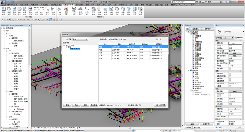 支持碰撞檢查構(gòu)件的篩選以及碰撞范圍的設(shè)置,生成沖突報(bào)告,支持二維、三維狀態(tài)的定位返查,同時(shí)支持碰撞報(bào)告導(dǎo)出。