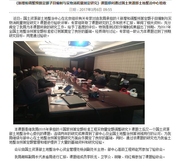 《新增和調(diào)整預(yù)算定額子目編制與實(shí)物消耗量測(cè)定研究》課題順利通過(guò)國(guó)土資源部土地整治中心驗(yàn)收