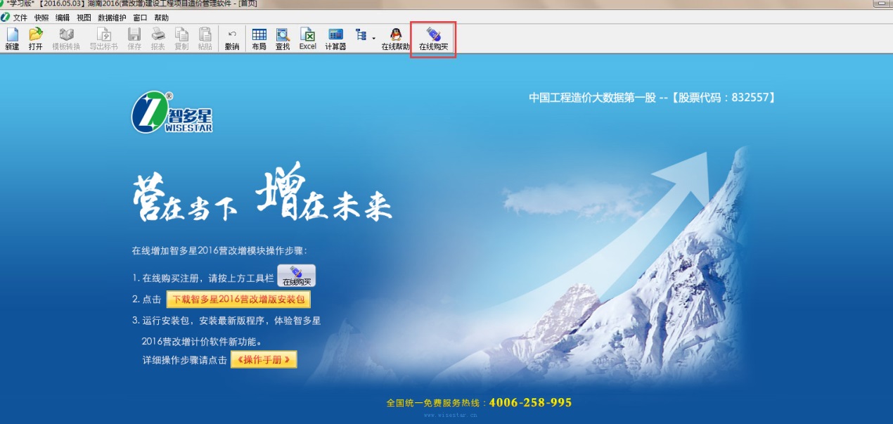 湖南“2016營(yíng)改增”計(jì)價(jià)辦法已于2016年5月1日起正式執(zhí)行,智多星也已第一時(shí)間將包含“營(yíng)改增計(jì)價(jià)辦法”的軟件程序公布在智多星官網(wǎng),供用戶下載。由于此次升級(jí)量巨大,為節(jié)省您的時(shí)間和精力,我們推薦您優(yōu)先使用“網(wǎng)上在線自助升級(jí)”功能,通過(guò)銀聯(lián)或支付寶付款,一鍵購(gòu)買、注冊(cè),安全便捷。具體操作請(qǐng)參照一下步驟: