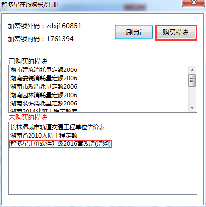 第三步:在軟件主界面,點(diǎn)擊上方“在線購(gòu)買 ”按鈕(圖1),在未購(gòu)買模塊中會(huì)出現(xiàn)“湖南計(jì)價(jià)軟件升級(jí)2016營(yíng)改增(增購(gòu))”模塊,點(diǎn)擊“購(gòu)買模塊”按鈕(圖2):