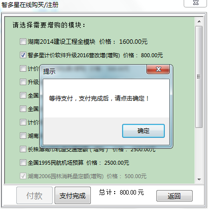 第四步:勾選‘智多星計(jì)價(jià)軟件升級(jí)2016營(yíng)改增(增購(gòu))’,或任意一項(xiàng)您需要購(gòu)買的模塊,之后點(diǎn)擊“付款”按鈕。